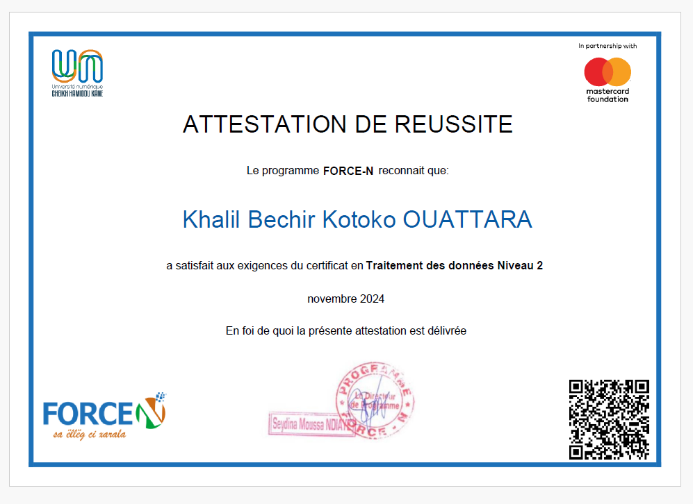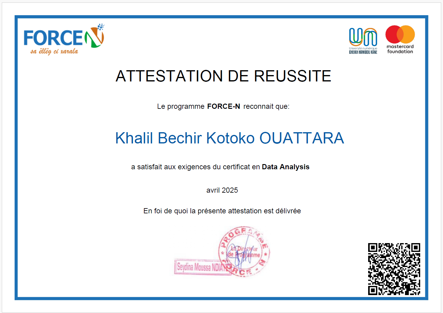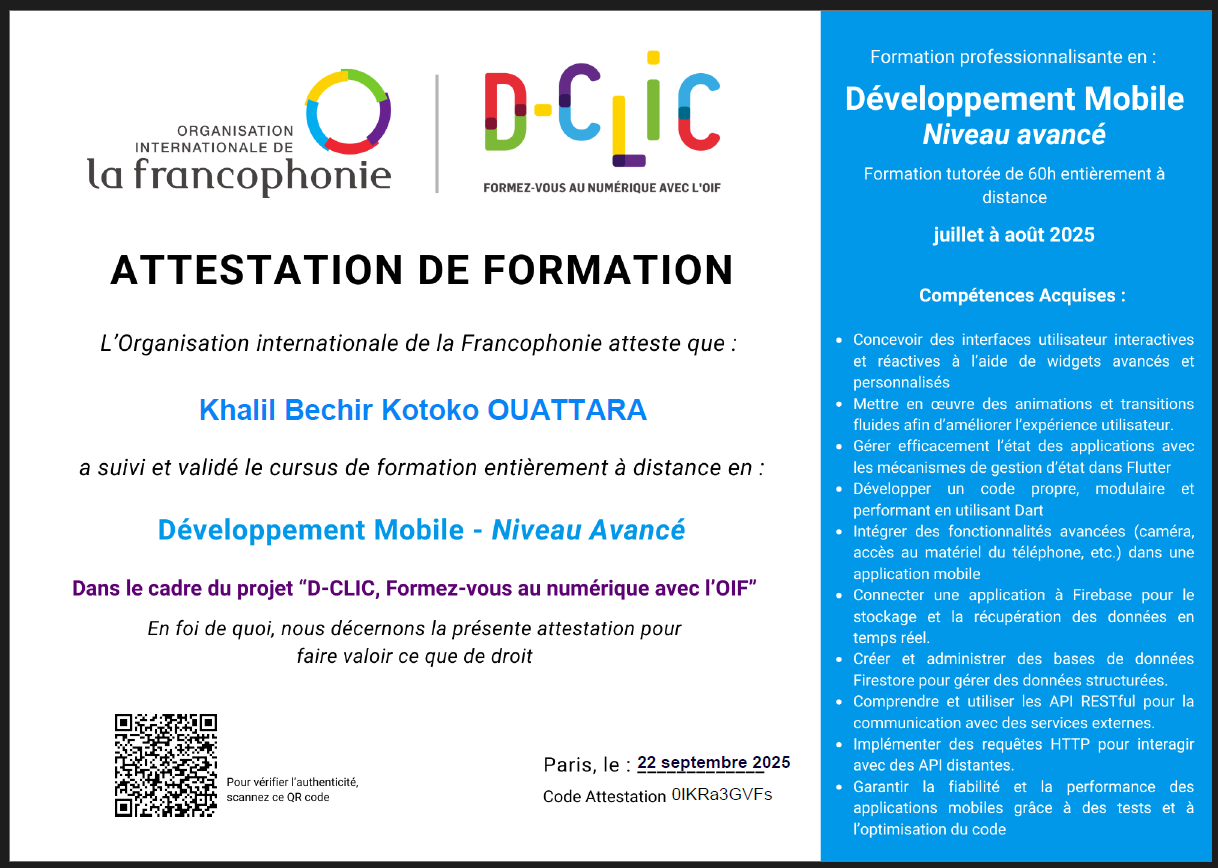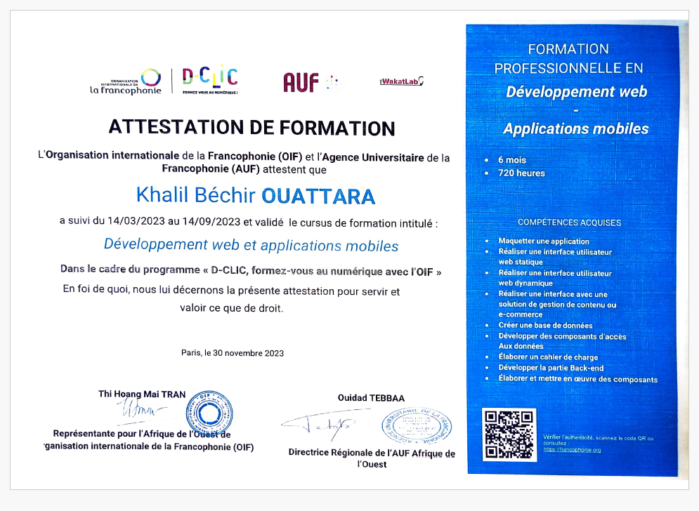 Je suis Ouattara Khalil Bechir, un passionné par le développement web. Avec un apprentissage en autodidacte et une formation diversifiée, j'ai acquis une expertise qui me permet de créer des solutions numériques performantes.